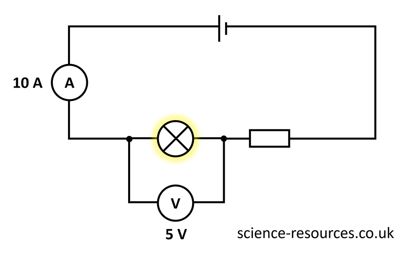 A circuit contains a battery, a resistor, a voltmeter and an ammeter. The battery has a potential difference of 5V, and the current flowing is 10A.